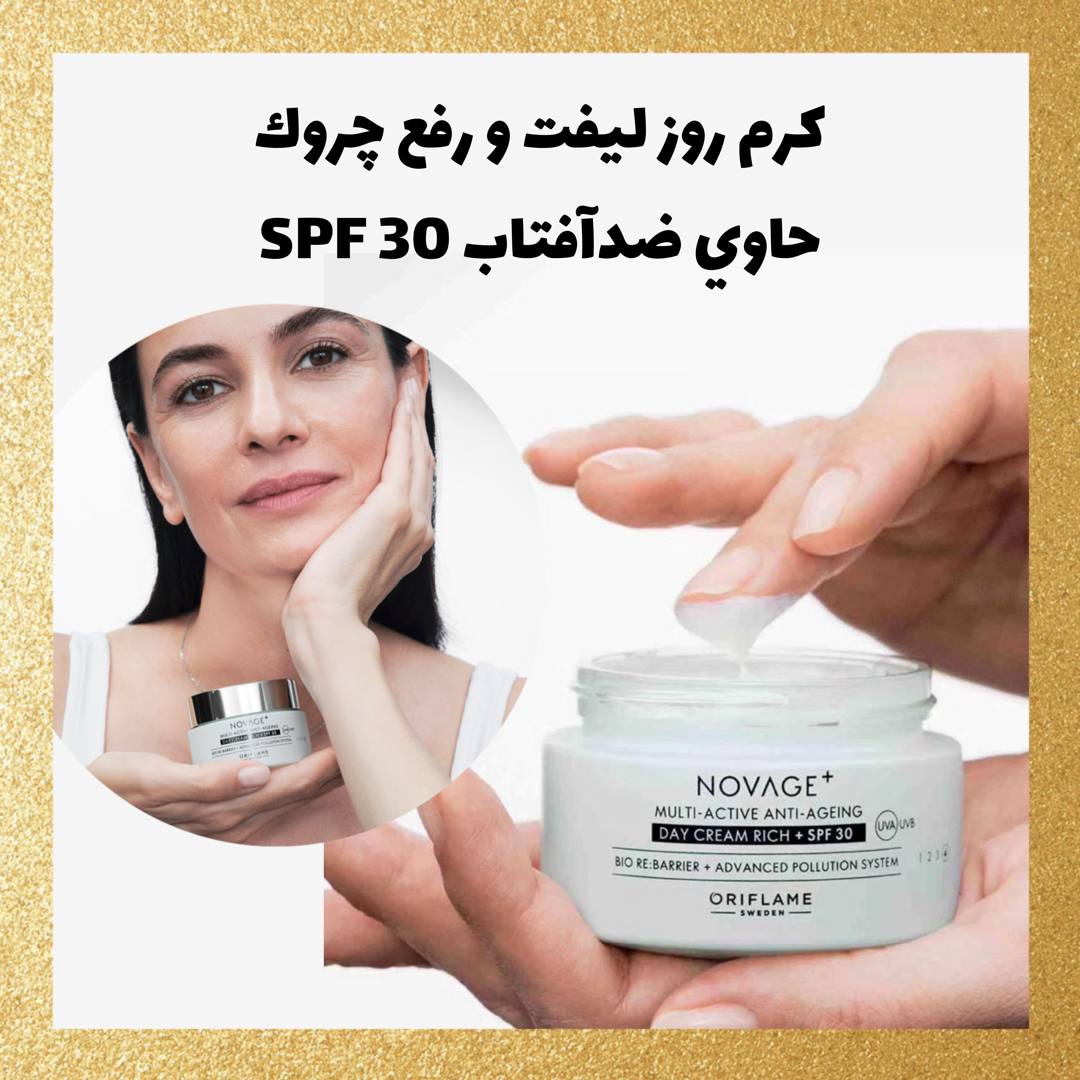 کرم روز لیفت و ضدچروک اوریفلیم (NovAge Day Cream Rich + SPF 30) یکی از محصولات حرفهای ضدپیری است که با ترکیبی پیشرفته از تکنولوژیهای روز دنیا، نهتنها پوست شما را آبرسانی و تغذیه میکند، بلکه با داشتن ضدآفتاب SPF 30 از پوست در برابر اشعههای مضر UVA و UVB نیز محافظت مینماید. این محصول انتخابی ایدهآل برای افرادی است که میخواهند در طول روز پوستی شاداب، لیفتشده و بدون چروک داشته باشند.